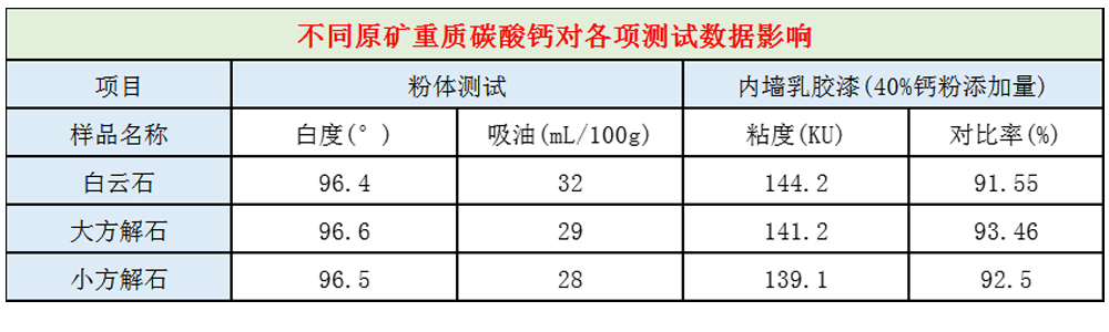為此本文選用在內墻乳膠漆中添加比例較高的重質碳酸鈣為測試對象,并選用白云石、大方解石及小方解石三種原礦,加工成1250目重質碳酸鈣,將其添加到內墻乳膠漆中,通過測定乳膠漆粘度、穩(wěn)定性和漆膜對比率指標來初步判定不同原礦對內墻乳膠漆的性能影響。