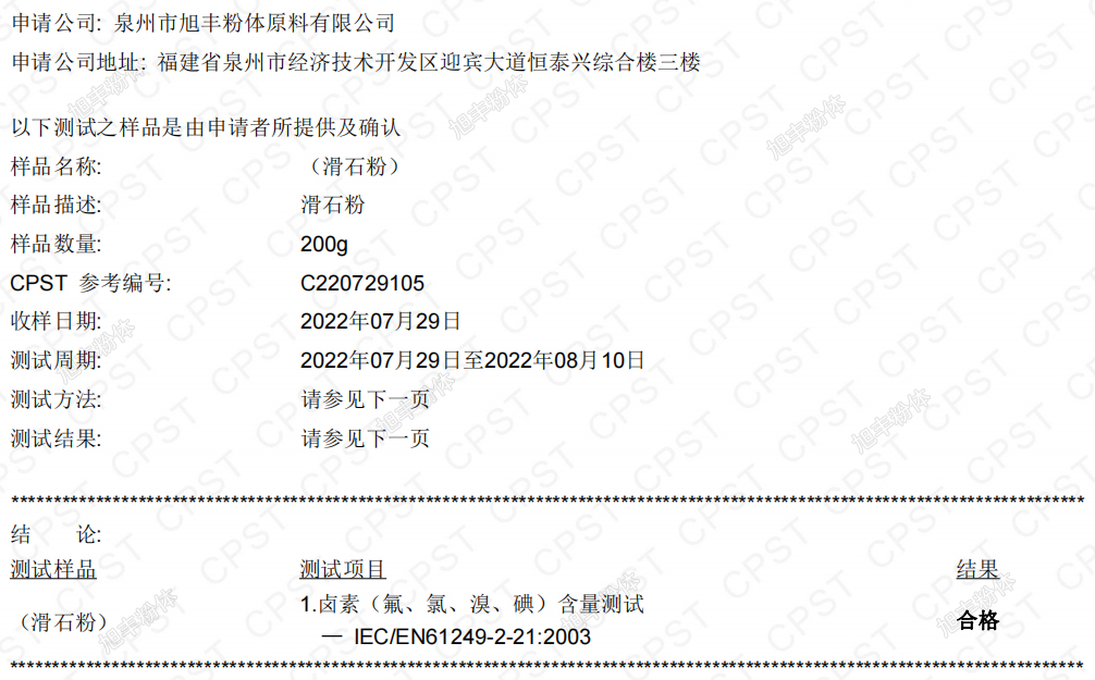 我司已連續(xù)多年將自身滑石粉送至第三方檢測機(jī)構(gòu)進(jìn)行鹵素含量測定,產(chǎn)品各項(xiàng)指標(biāo)均可滿足標(biāo)準(zhǔn)要求,客戶可放心使用,具體檢測結(jié)果見下表。